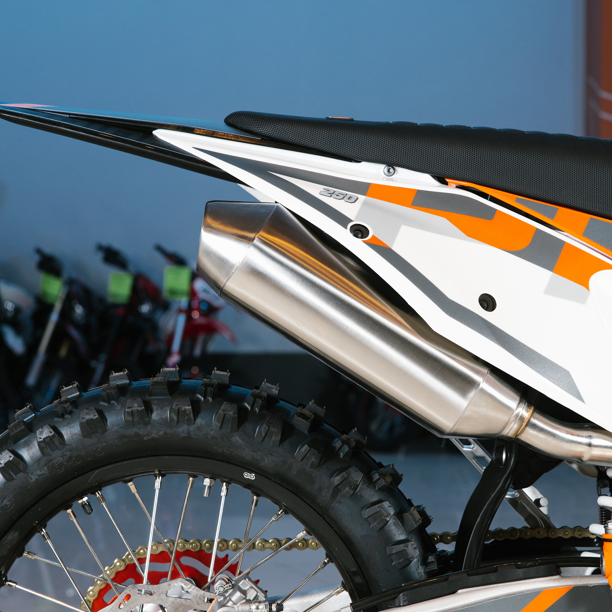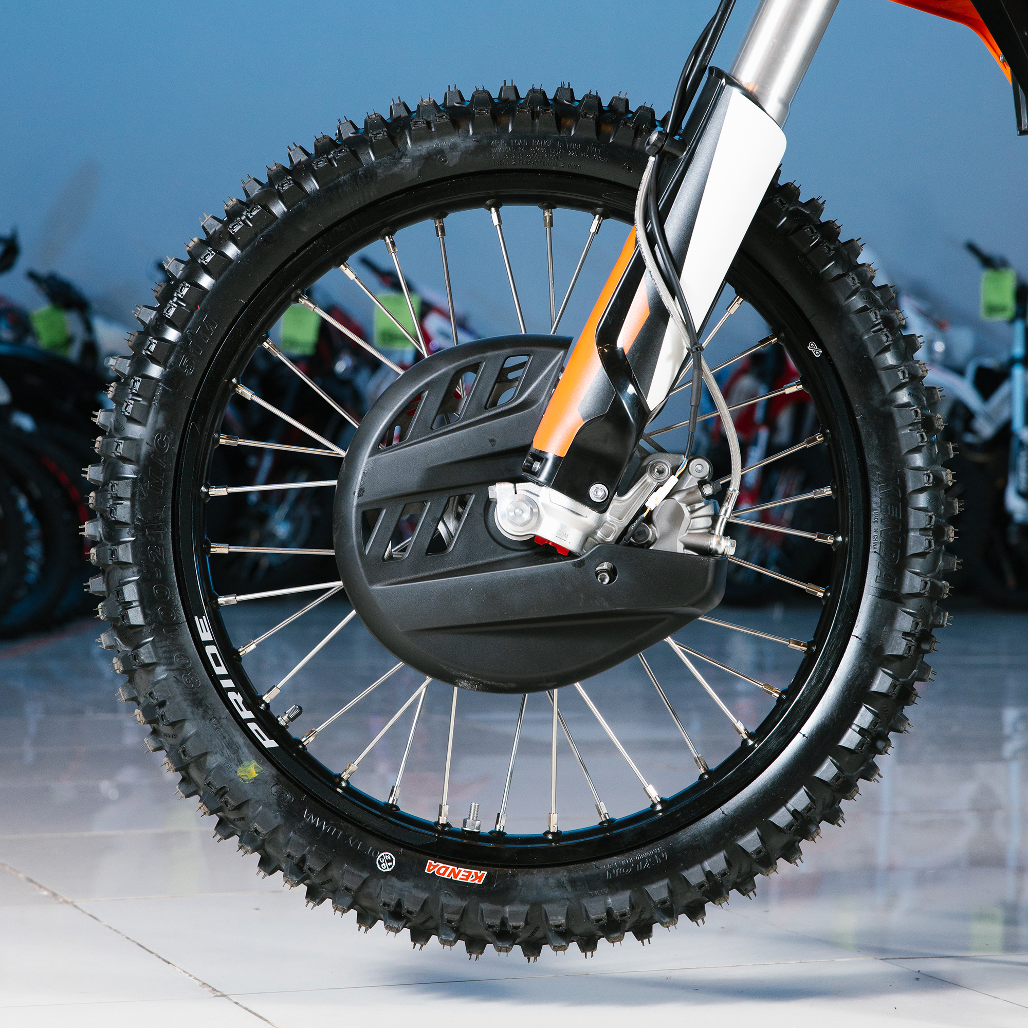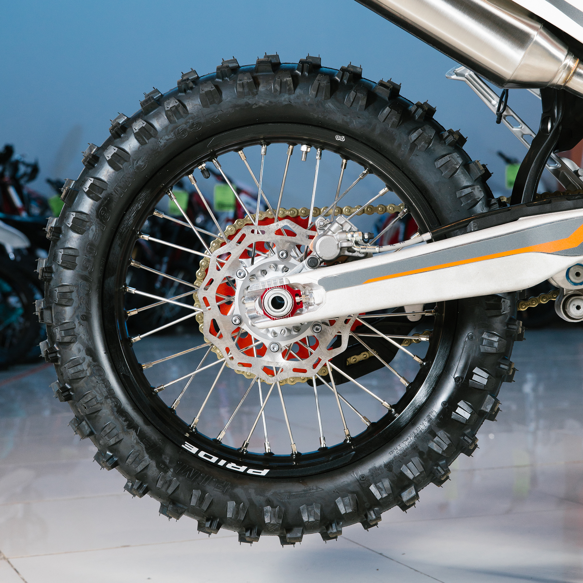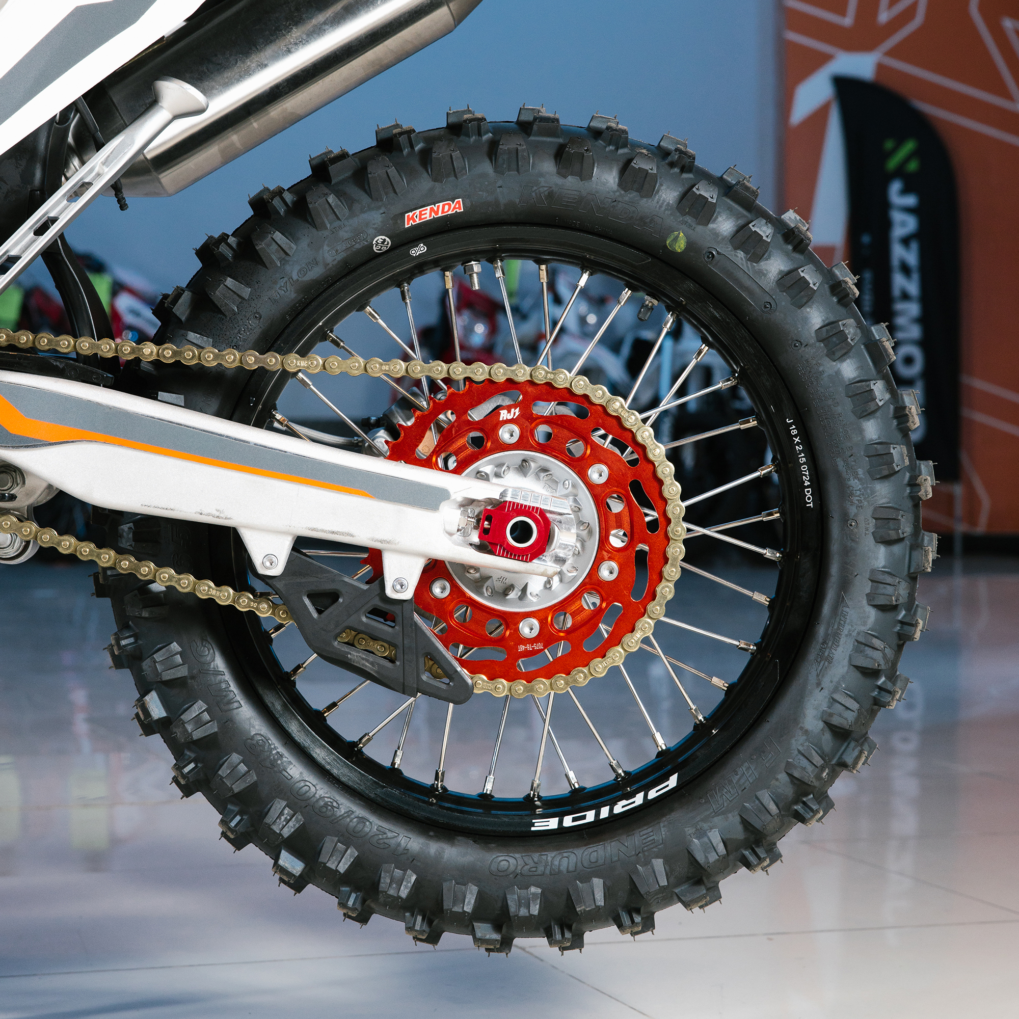 Спереди и сзади установлены антибуксаторы бренда "AJ1", которые притягивают покрышку к ободу, позволяя ездить по бездорожью при низком давлении в камерах, не давая покрышке проворачиваться во время езды. Размер передней покрышки: 80/100 R21. Размер задней покрышки: 120/90-R18. Модель комплектуется "жирной" резиной "KENDA". Все эти характеристики позволяют мотоциклу отлично себя чувствовать в песке и грязи.